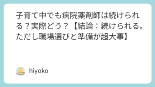 今日は、hiyokoです。3人の子育てをしながら、総合病院で薬剤師として勤務しています。育休・転職・離職などで現場を離れると、現場の空気についていけず、「どこから勉強し直せばいいの?」と不安になりますよね。病院薬剤師は扱う薬剤や業務も幅広く...
